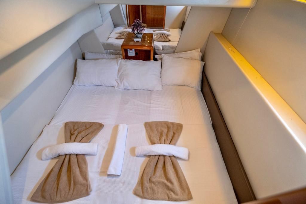 İki kişilik mürettebat tatilinize düzenli ve sıcak bir akış katar. Kaptan her rotayı güvenle planlar ve sizi en doğru koylara yönlendirir. Gemici–aşçı hem güvertede hem mutfakta aktif bir tempo oluşturur. Böylece yemekler, servis ve temizlik gün boyunca düzgün şekilde ilerler. Ekibin bu yaklaşımı tatilinize hem rahatlık hem hız kazandırır.