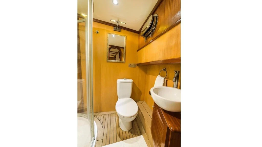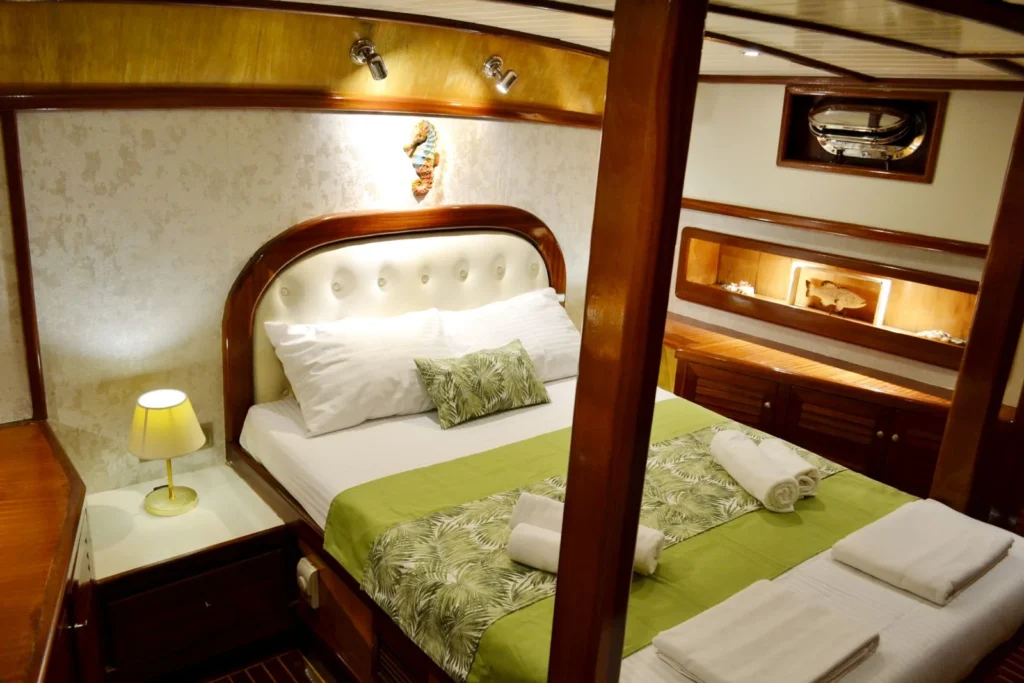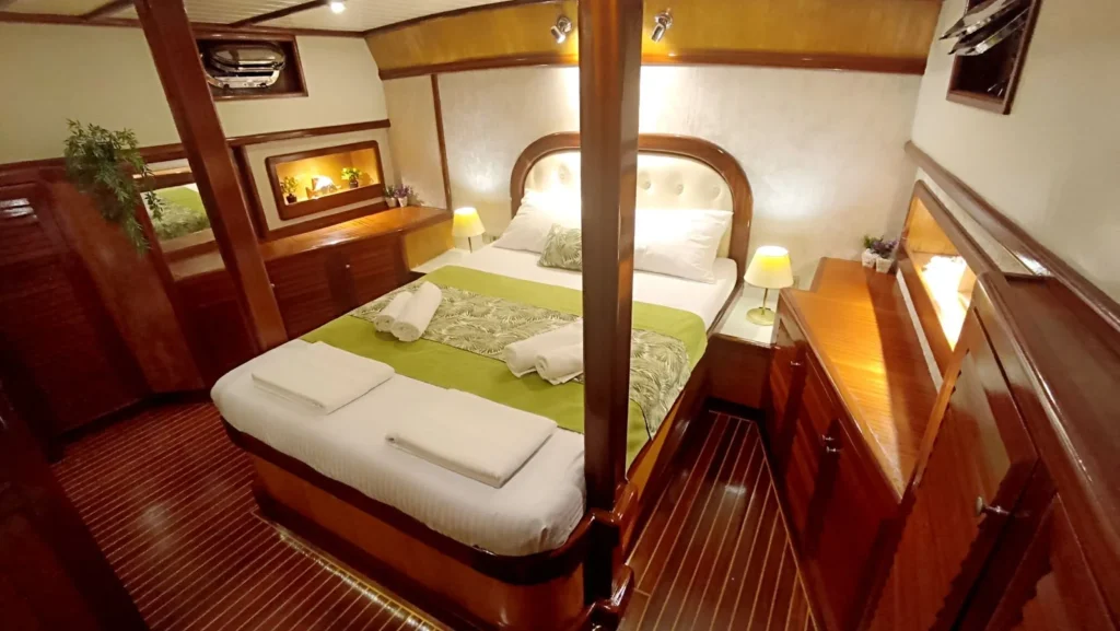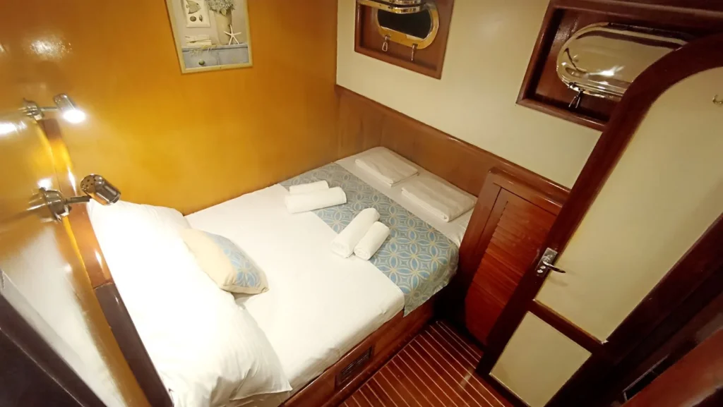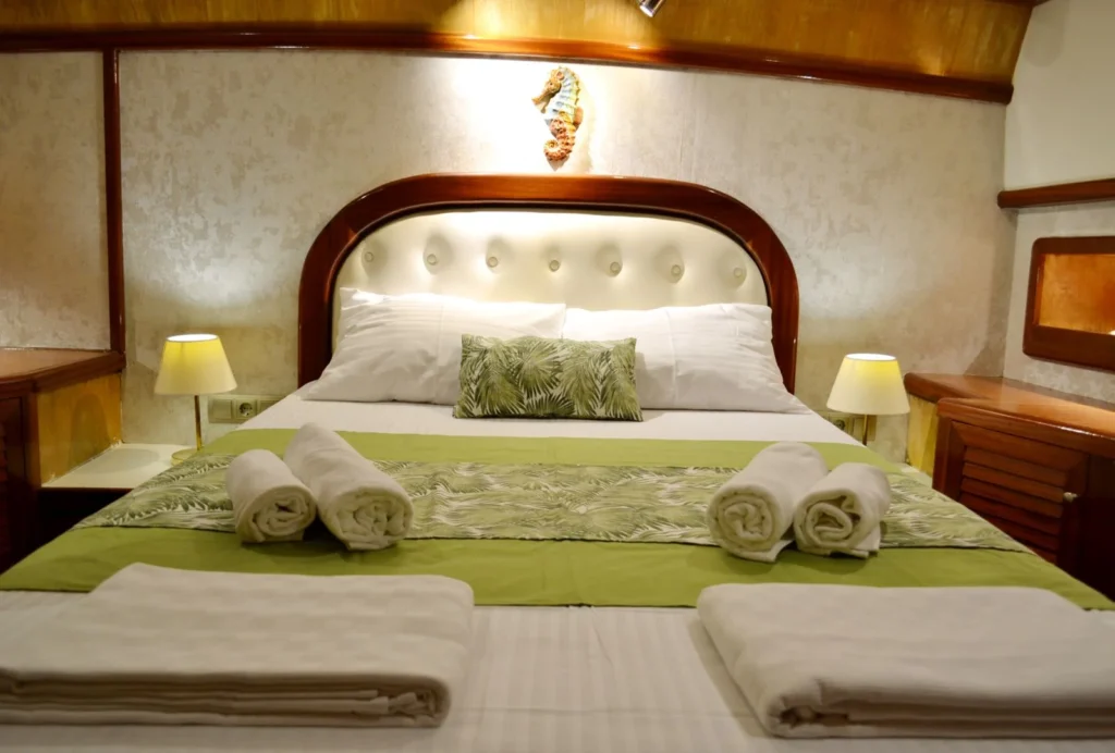 Teknede toplam 3 kabin yer alır. 1 master kabin ve 2 double kabin, küçük gruplar ve aileler için ideal bir konaklama düzeni sunar. Her kabin özel duş ve tuvalet içerir. Ayrıca yüz, vücut ve ayak havluları konforu artırır. Kabin planı hem mahremiyet hem rahatlık sağlar. Böylece herkes kendine ait konforlu bir alan kullanır.