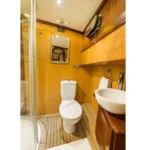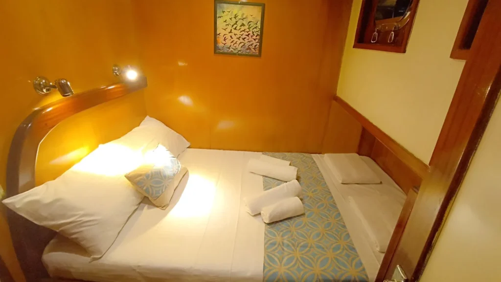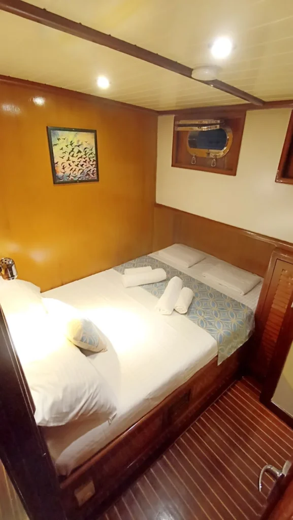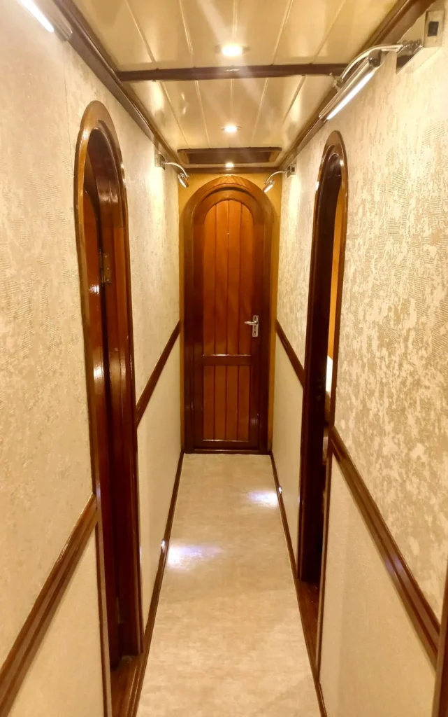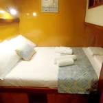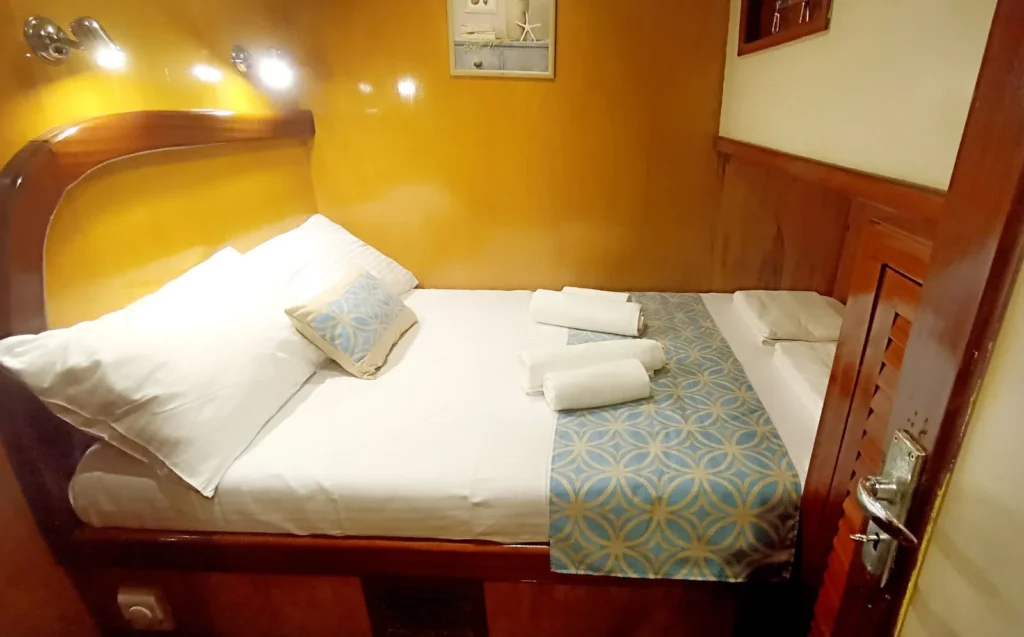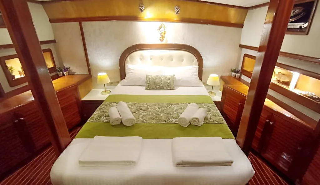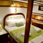 Teknede toplam 3 kabin yer alır. 1 master kabin ve 2 double kabin, küçük gruplar ve aileler için ideal bir konaklama düzeni sunar. Her kabin özel duş ve tuvalet içerir. Ayrıca yüz, vücut ve ayak havluları konforu artırır. Kabin planı hem mahremiyet hem rahatlık sağlar. Böylece herkes kendine ait konforlu bir alan kullanır.