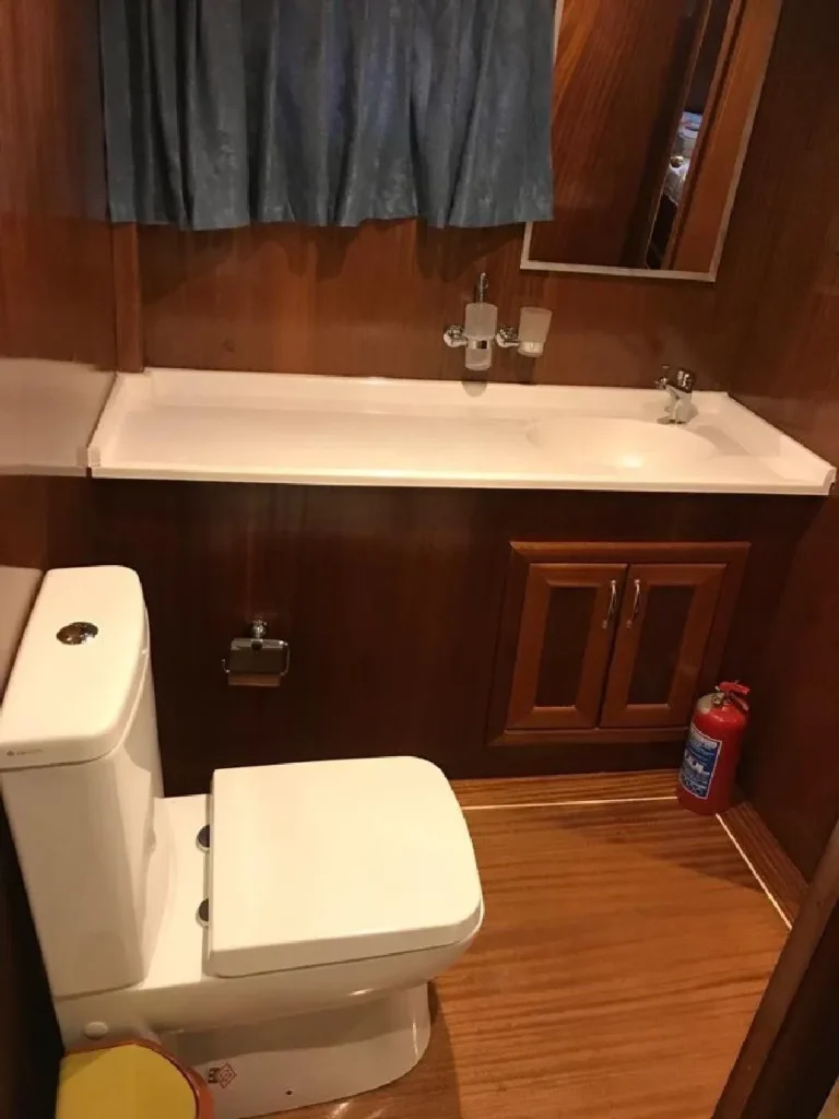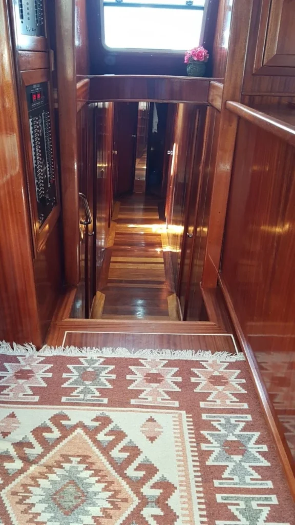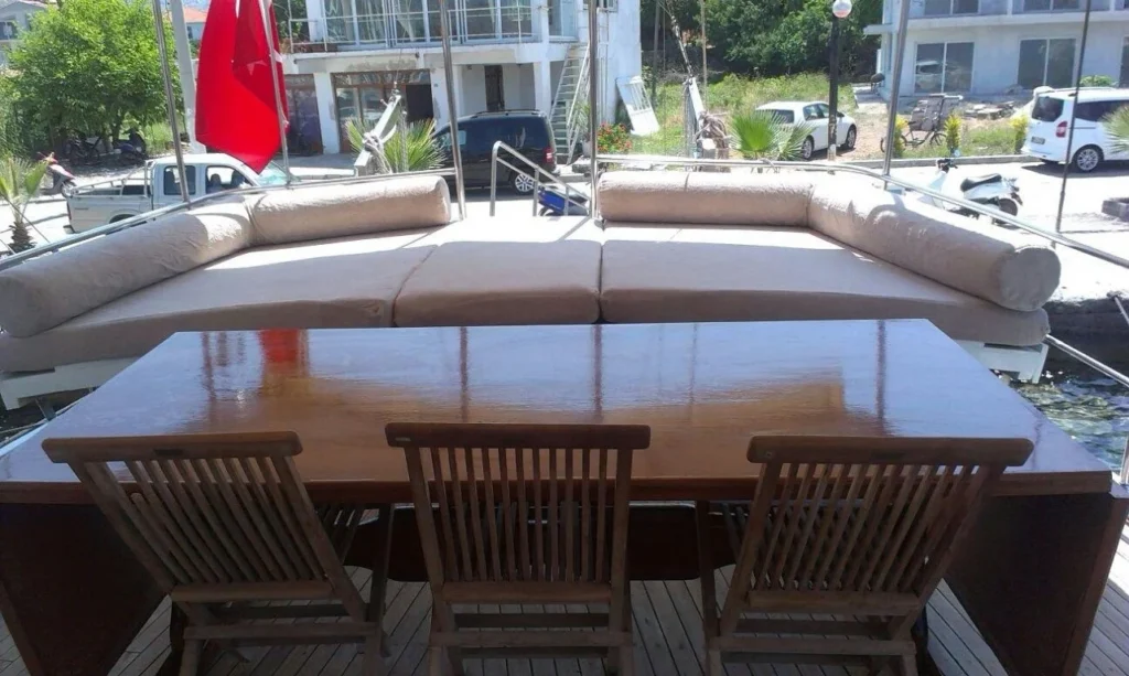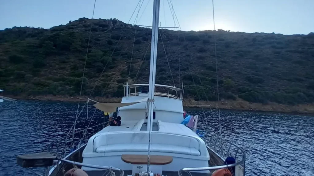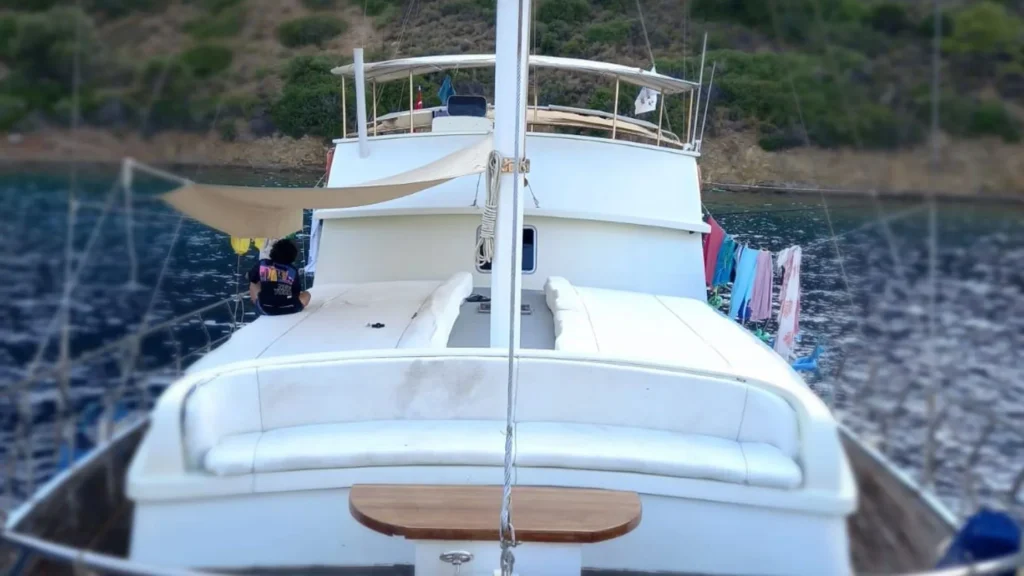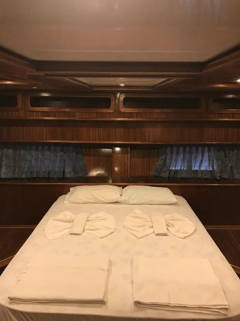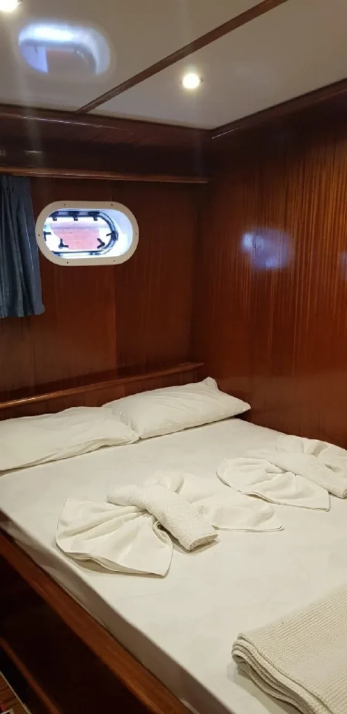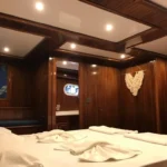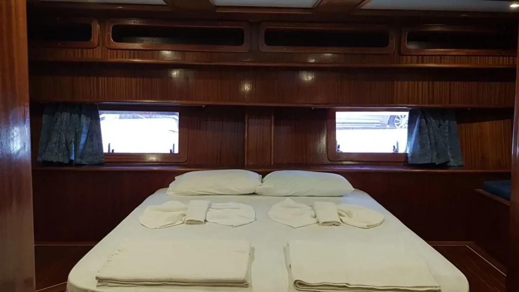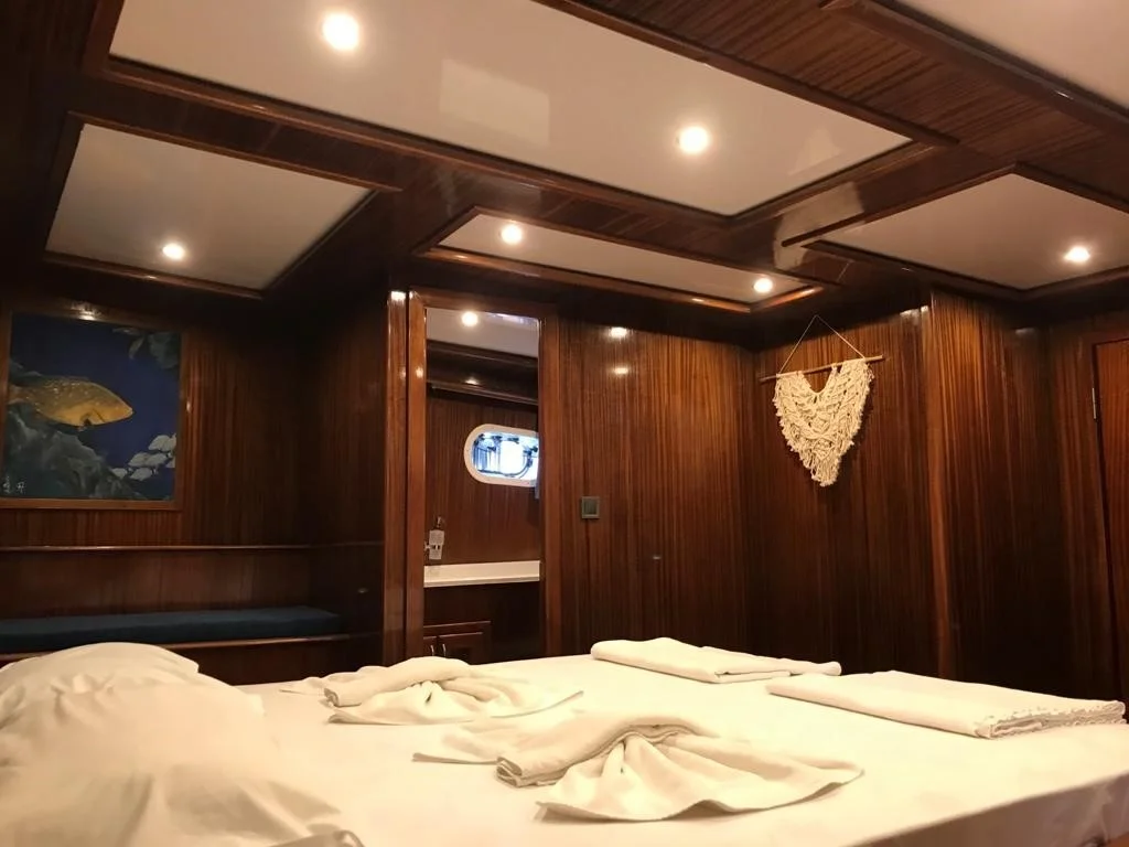 Marmaris 6 kabin gulet kiralama arayan misafirler bu 24 metrelik gulette hem sıcak hem sade bir atmosfer bulur. Beş double kabin ve bir master kabin tatilinize dengeli bir yerleşim sağlar. Ayrıca her kabindeki özel duş ve tuvalet günlük akışı hızlandırır. 6,70 metrelik geniş gövde ferah bir yaşam alanı sunar. Kliması olmamasına rağmen güverteden gelen doğal esinti yaz boyunca rahat bir ortam yaratır.