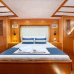 Gulet Bodrum limanından rotaya çıkar. Böylelikle Ege’nin popüler ve berrak koylarına kısa sürede ulaşırsınız. 4000 litre yakıt ve 5000 litre su kapasitesi, planlı mavi yolculuklar için dengeli bir kullanım sağlar. Aynı zamanda jeneratör sistemi tüm teknik donanımı kesintisiz destekler. Klima gün boyu çalışır; bu nedenle yaz sıcaklarında serinlik her alanda hissedilir. Hem kabinlerde hem ortak alanlarda konfor sürekli korunur.