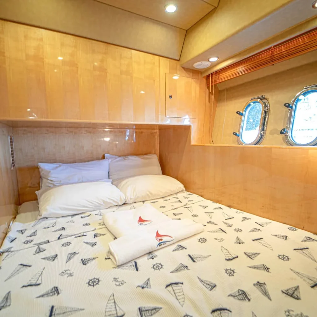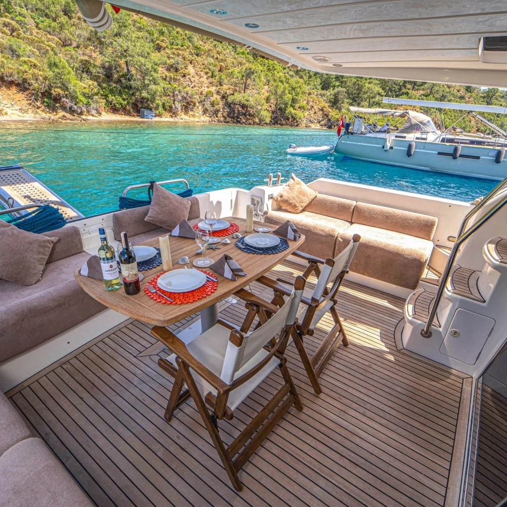 Motoryat Göcek limanından rotaya çıkar. Böylelikle bölgenin korunaklı ve berrak koylarına kısa sürede ulaşırsınız. Yakıt ve su kapasitesi net belirtilmediği için rota planını kaptanla birlikte esnek şekilde belirlersiniz. Ancak jeneratör sistemi tüm donanımı kesintisiz destekler. Klima gün boyu çalışır; bu nedenle yaz aylarında serinlik sürekli devam eder. Hem kabinlerde hem ortak alanlarda rahat bir ortam oluşur.