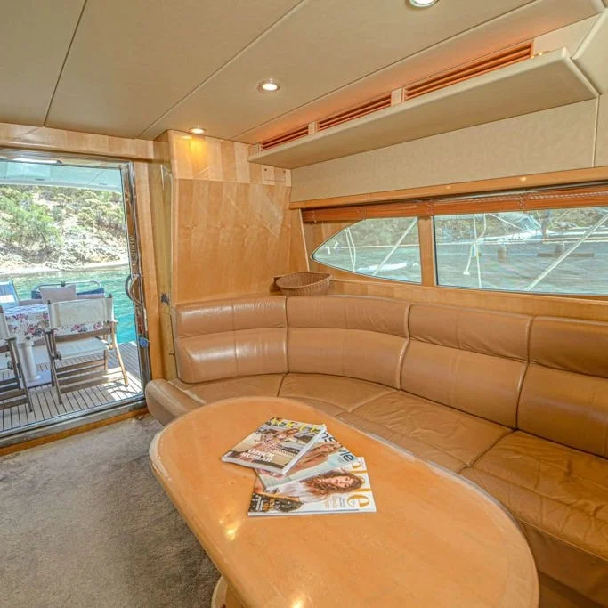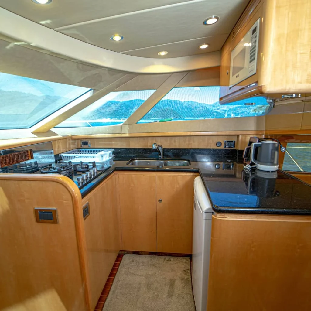 Bu motoryat, pratik tatil anlayışını güçlü donanımlarla destekler. Tam donanımlı mutfak günlük yemek düzenini kolaylaştırır. Müzik sistemi, seyir sırasında keyifli bir atmosfer yaratır. Böylece yolculuklar daha akıcı ve eğlenceli hale gelir.
