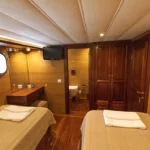 Teknede toplam 5 kabin bulunur. 2 master kabin, 2 twin kabin ve 1 double kabin, aileler için esnek ve dengeli bir konaklama düzeni sunar. Her kabinde özel duş ve tuvalet yer alır. Ayrıca internet bağlantısı ve televizyon, günlük alışkanlıkları denizde de sürdürmenizi sağlar. Böylece herkes kendine ait konforlu bir alan bulur. Kabin planı, mahremiyet ve kullanım kolaylığını dengeli biçimde sunar.