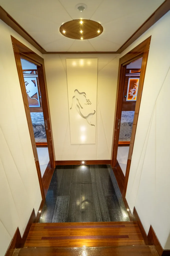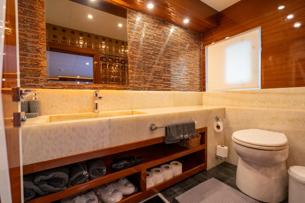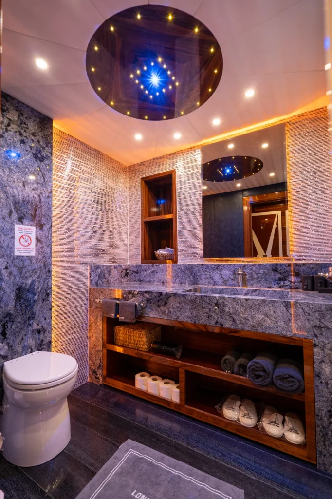 Teknede toplam 5 kabin bulunur. 1 VIP master kabin ve 3 VIP double kabin, üst segment konaklama beklentilerine net biçimde karşılık verir. Her kabin özel duş ve tuvalet içerir. Aynı zamanda internet bağlantısı, televizyon ve saç kurutma makinesi günlük yaşamı kolaylaştırır. Böylece herkes kendine ait, geniş ve rahat bir alan kullanır. Kabin planı, mahremiyet ile lüksü birlikte sunar.
