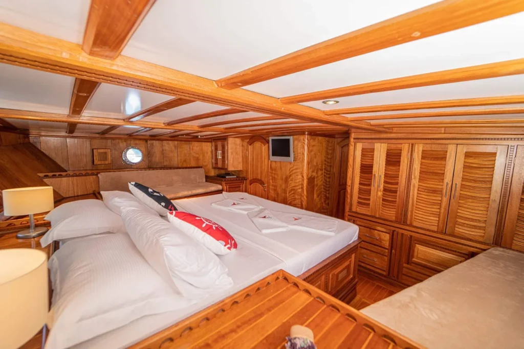 Teknede toplam 6 kabin bulunur. 2 master kabin, 2 double kabin ve 2 twin kabin farklı konaklama ihtiyaçlarına rahatça uyum sağlar. Her kabinde özel duş ve tuvalet yer alır. Ayrıca internet bağlantısı ve televizyon, denizdeyken de günlük alışkanlıkları sürdürmenize yardımcı olur. Böylece herkes kendine ait düzenli ve konforlu bir alan kullanır. Kabin yerleşimi, mahremiyet ve birlikte tatil dengesini net biçimde kurar.