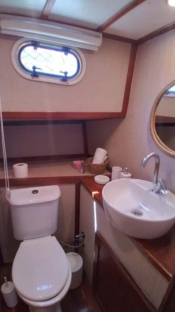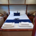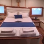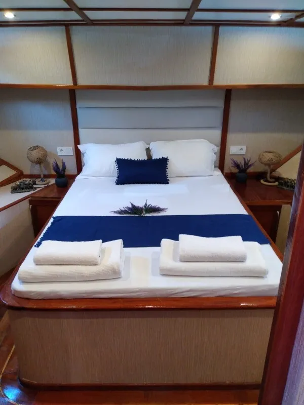 Teknede toplam 5 kabin yer alır. 2 master kabin ve 3 double kabin, aileler ve arkadaş grupları için ideal bir konaklama düzeni sunar. Her kabin özel duş ve tuvalet içerir. Ayrıca yüz, vücut ve ayak havluları konforu artırır. Kabin planı hem mahremiyet hem rahatlık sağlar. Böylece herkes kendine ait düzenli bir alan kullanır.