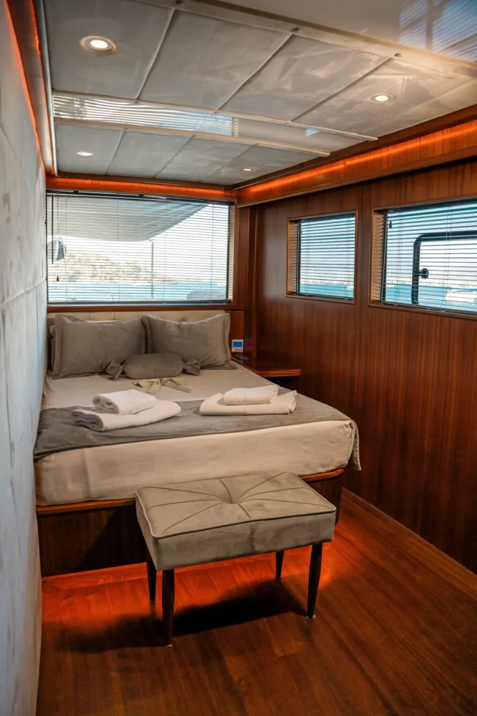 Fethiye trawler kiralama arayan misafirler bu 22 metrelik modern teknede hem geniş hem de konforlu bir yaşam alanı bulur. Üç double kabin ve bir master kabin tatilinize düzenli bir yerleşim sağlar. Ayrıca her kabindeki özel duş ve tuvalet günlük akışı hızlandırır. 6 metrelik gövde geniş bir yaşam alanı oluşturur. Klima hem kabinlerde hem salonda serin bir atmosfer yaratır. Böylece sıcak günlerde bile tatil rahat ve keyifli şekilde ilerler.