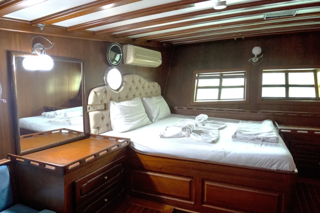 Fethiye büyük gulet kiralama arayan misafirler bu 32 metrelik teknede geniş, dengeli ve konforlu bir alan bulur. Altı double ve iki triple kabin farklı gruplara uyum sağlar. Ayrıca her kabinin özel duş ve tuvaleti hazırlık sürecini hızlandırır. 7.60 metrelik geniş gövde hem iç mekânda hem güvertede rahat bir yaşam alanı oluşturur. Klima hem kabinlerde hem salonda gün boyunca serinlik sunar. Böylece sıcak günlerde bile teknede dengeli bir atmosfer korunur.