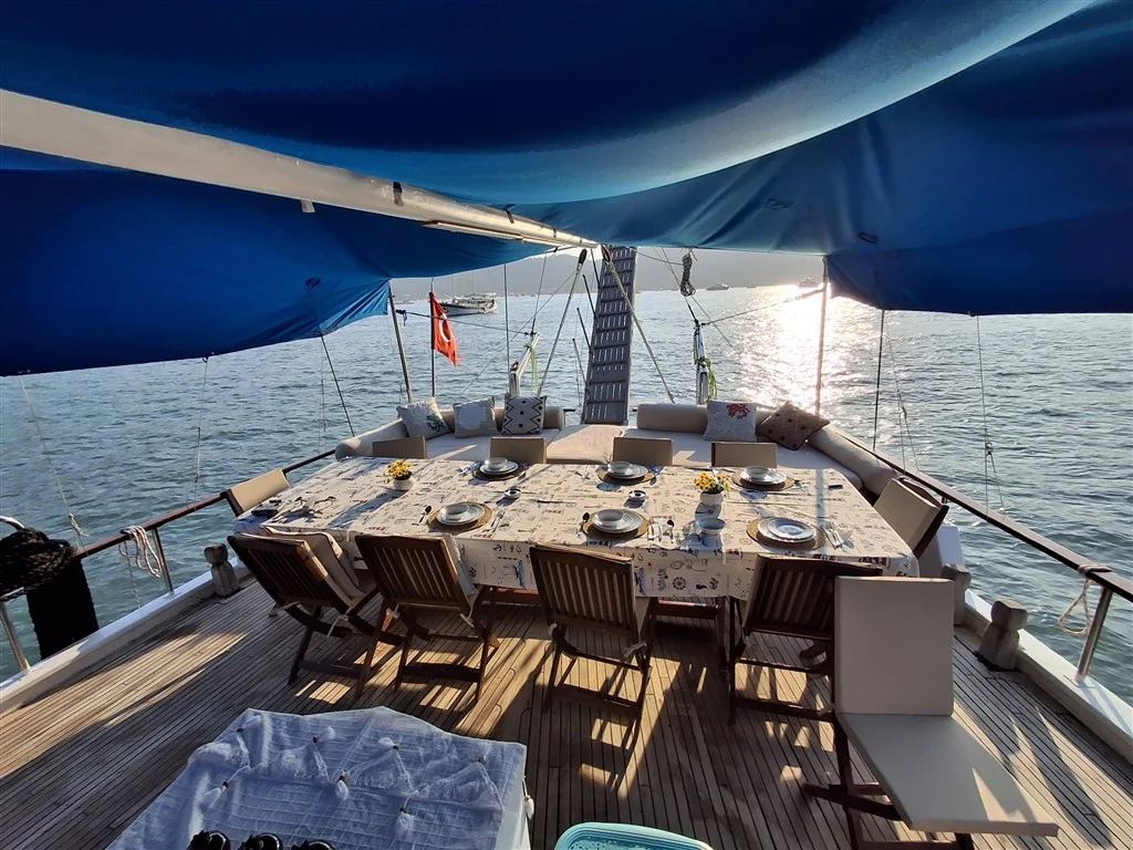 Göcek ekonomik gulet kiralama düşünenler bu teknede geniş alanı, sade konforu ve huzurlu deniz keyfini birlikte yaşar.