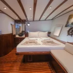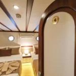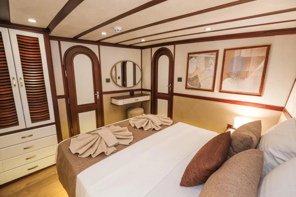Fethiye büyük gulet kiralama arayan kalabalık gruplar bu 36 metrelik teknede geniş, dengeli ve lüks bir alan bulur. Sekiz kabin farklı konaklama düzenlerine uyum sağlar. Altı double ve iki triple kabin ailelere, arkadaş gruplarına ve kurumsal ekip gezilerine ideal bir yerleşim sunar. Ayrıca her kabindeki duş ve tuvalet güçlü bir tempo yaratır. 8 metrelik genişlik iç mekâna ferahlık katar. Klima hem kabinlerde hem salonda gün boyunca serin bir atmosfer kurar.