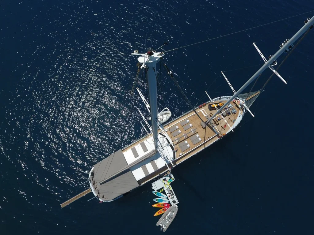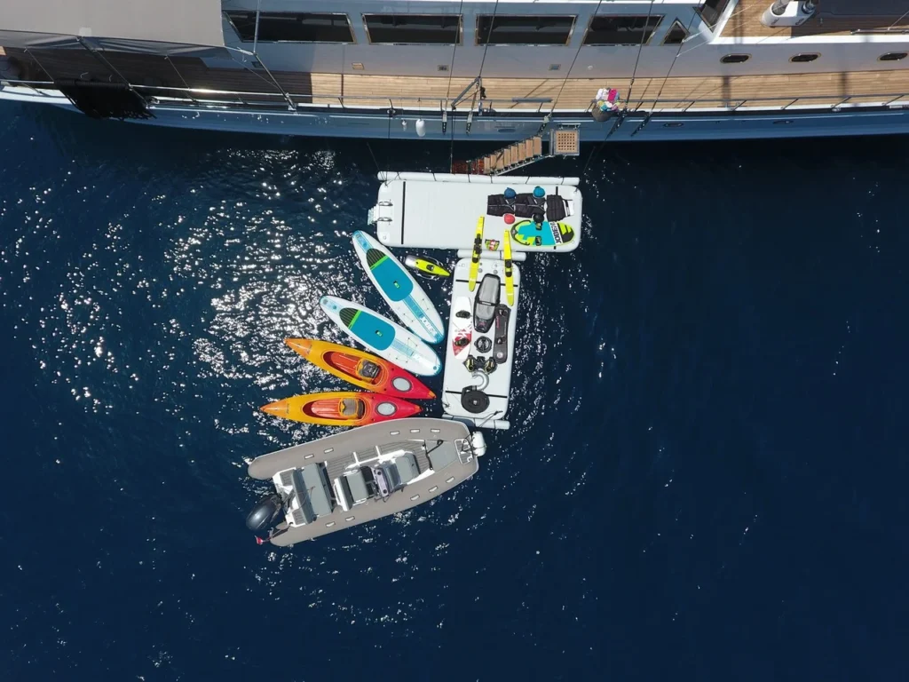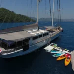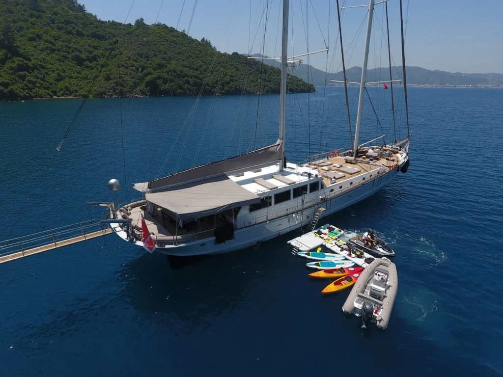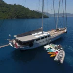 Bu gulet, su sporları konusunda benzersiz bir çeşitlilik sunar. Jet ski, wakeboard ve su kayağı adrenalin tutkunlarını memnun eder. Zapata flyboard ve sub wings deneyimi tatili unutulmaz hâle getirir. Banana, doughnut ve kneeboard grup eğlencesini zirveye taşır. Dört paddle board ve iki kano ise sakin koylarda özgür keşifler sağlar. Şnorkel ve palet takımı berrak sularda su altını yakından görme fırsatı sunar. Balıkçılık ekipmanları ise daha dingin anlara eşlik eder.