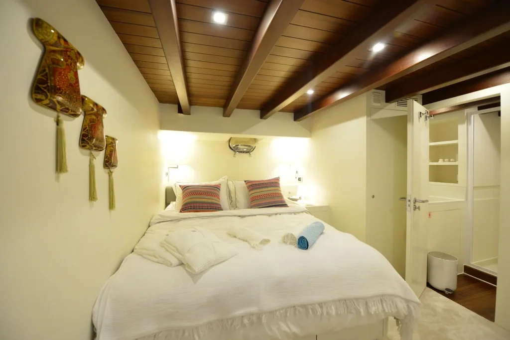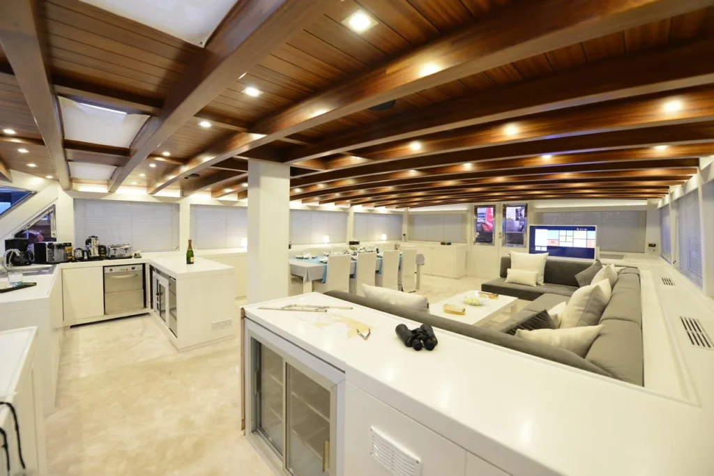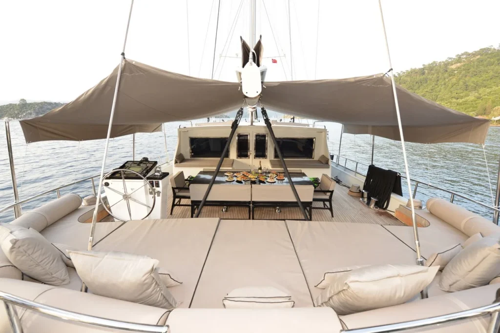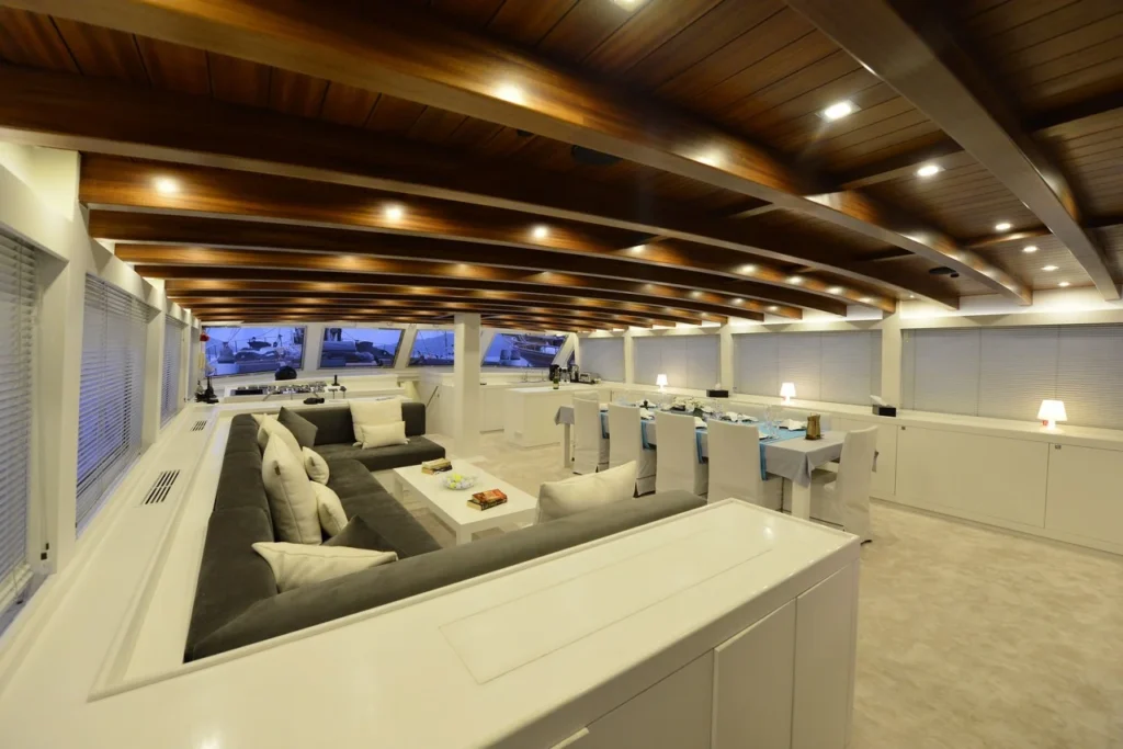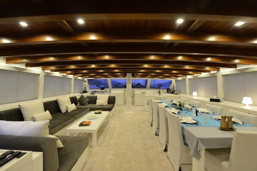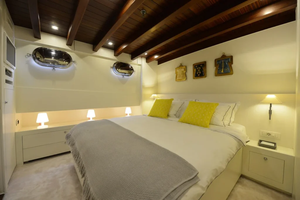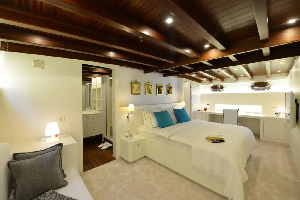 Bodrum ultra lüks gulet kiralama arayan misafirler bu 38 metrelik teknede ayrıcalıklı bir yaşam alanı deneyimler. Öncelikle beş kabinli yerleşim, konforu üst seviyeye taşır. İki master, iki double ve bir suit master kabin, her misafire özel alan hissi sunar. Ayrıca her kabindeki duş ve tuvalet günlük rahatlığı artırır. Bununla birlikte 8,30 metrelik genişlik, hem iç mekânda hem güvertede ferah bir atmosfer oluşturur. Klima sistemi 24 saat aktif çalışır. Böylece günün her anında ideal sıcaklık korunur.